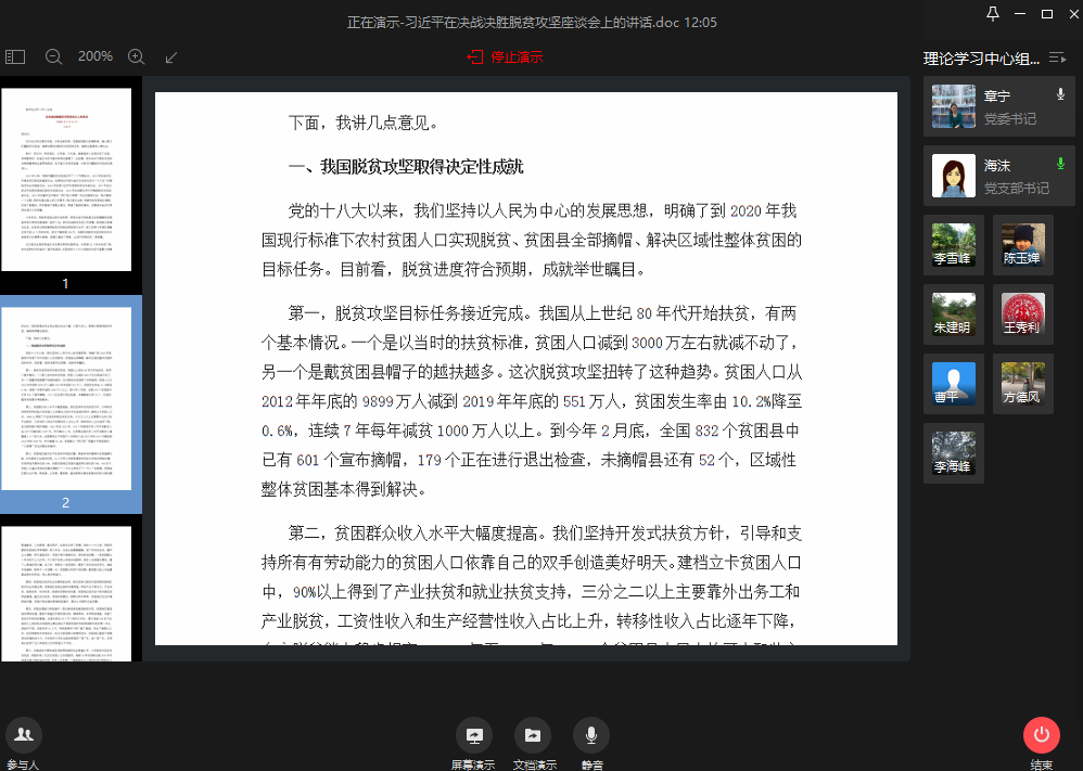 首先,大家集中学习了习近平总书记在决战决胜脱贫攻坚座谈会上的讲话,然后,集中学习了学校2020年党建和宣传思想文化工作要点和学校2020年组织工作计划。章宁书记首先对讲话精神和文件精神进行了深刻解读,她指出:习近平总书记的重要讲话,充分肯定了脱贫攻坚取得的成绩,深刻分析了脱贫攻坚面临的形势,对加强党对脱贫攻坚的领导、高质量完成脱贫攻坚目标任务提出明确要求,具有很强的指导性和针对性,进一步坚定了全党全社会坚决打赢脱贫攻坚战的信心决心,她结合学校的扶贫工作领导小组工作会议精神,按照学校脱贫攻坚工作的总体安排,对学院的“以购代捐”工作进行了动员和部署;接着,方德风副书记针对学校2020年党建和宣传思想文化工作要点中的“坚决维护校园安全稳定”,传达了学校文件和会议精神;随后,组织员曹平老师、副院长王秀利老师、副院长李海峰老师、伟德国际1946bv党委委员朱建明教授、伟德国际1946bv党委委员李雪峰老师、伟德国际1946bv党委委员海沫老师、伟德国际1946bv党委委员陈玉婵老师针对习近平总书记在决战决胜脱贫攻坚座谈会上的讲话精神、学校2020年党建和宣传思想文化工作要点和学校2020年组织工作计划中的相关内容,并结合疫情防控工作和脱贫攻坚工作进行了发言和讨论。