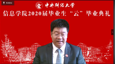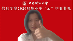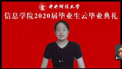接着,毕业生代表同学发言。信息管理16的白如玉同学首先代表2020届本科毕业生发言。她回忆了毕业生同学们在中财大度过的四年难忘时光,学习生活中得到了师友的宝贵指引和陪伴,四年中,同学们丰富自我,成就梦想。她提到,在中财这所财经类院校,伟德国际1946bv拥有财经和信息化学习的交叉背景,赋予了毕业生更丰富的选择,回归学术本质,引领学生不断探索。白如玉同学又回顾了2020年毕业季的意外时光,面对疫情带来的种种不确定,大多数人仍旧稳步向理想前行。她坚信每一位信院学子在未来的道路上都能担起一份责任,永葆对生活的兴趣,拥有独立自主的能力和美好的前途。