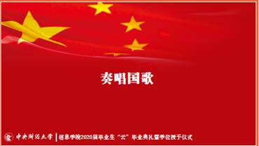 在暖心亲切的相互致意后,主持人方德风副书记宣布伟德国际1946bv2020届毕业生“云”毕业典礼正式开始,典礼在庄严的国歌声中拉开帷幕。