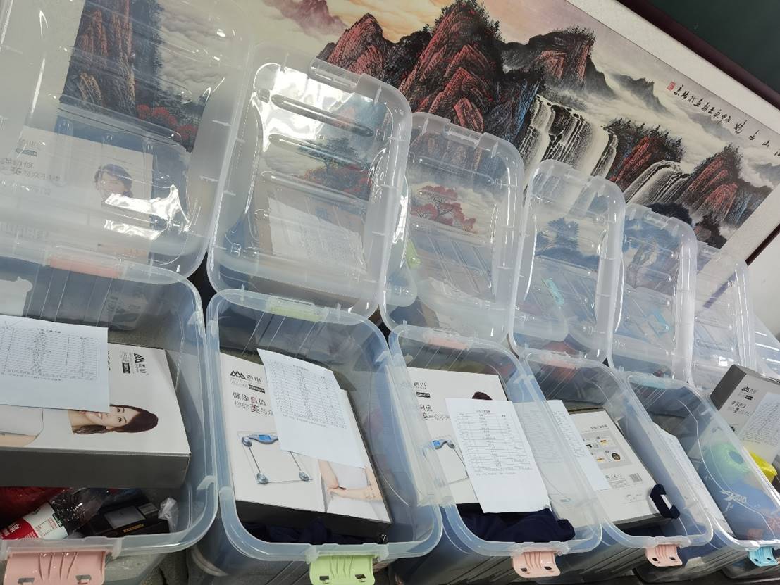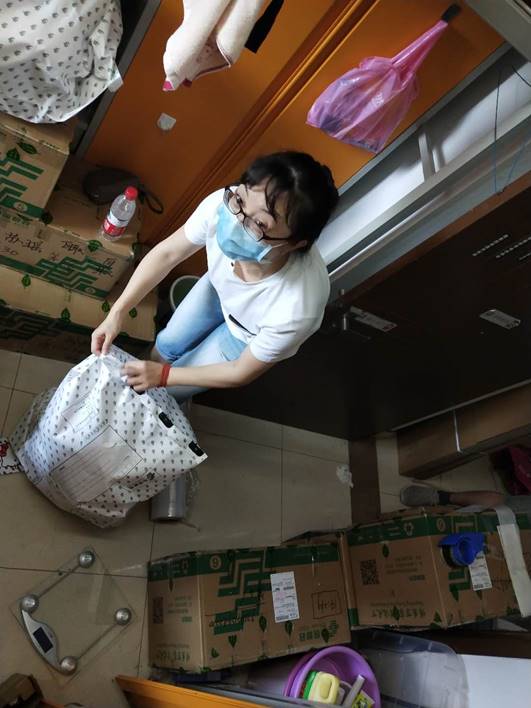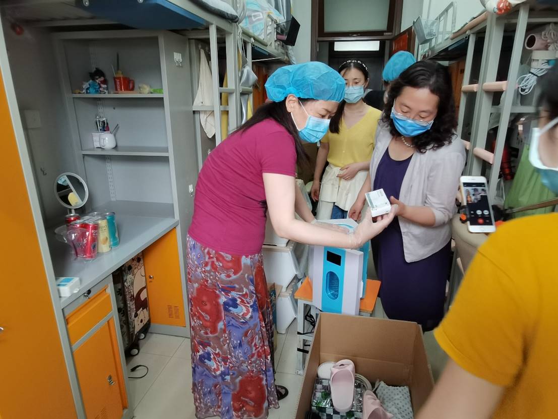 老师们在房间内分类整合、密封箱子。从上铺到桌底,从书桌到窗台,大到铺盖、脸盆,小到充电器,挂饰,无论物品大小,宿舍边边角角的每一件物品老师们都耐心询问,细心处理。