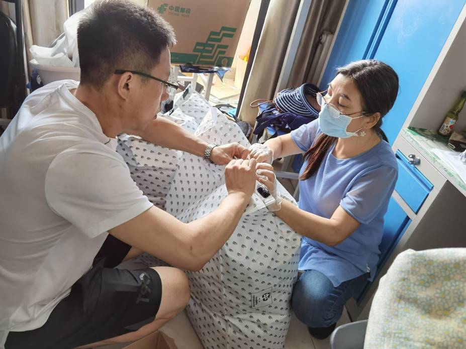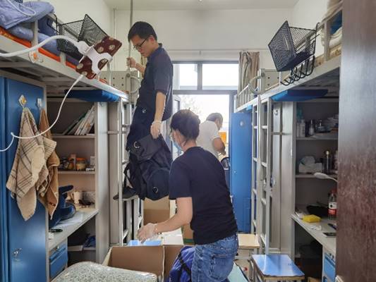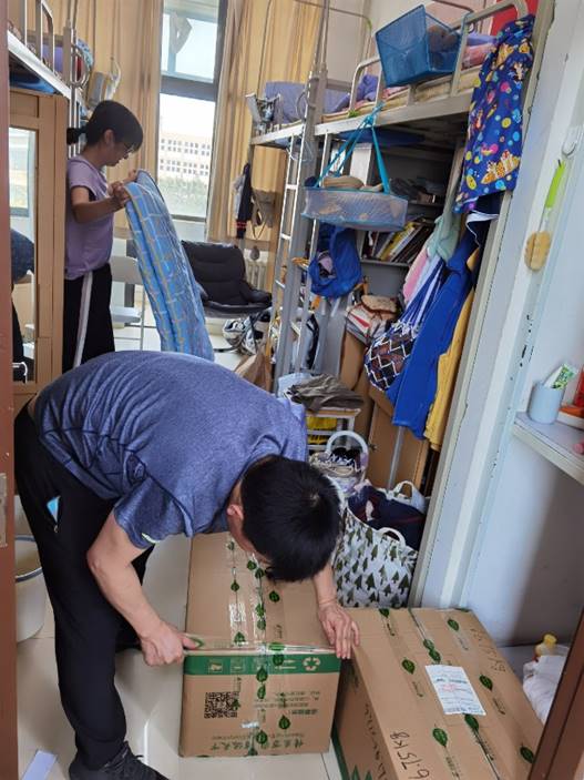 我院教师们积极投入到工作中,与学生们一边视频一边打包行李,一一确认物品存放位置,做好沟通交流,且关注关照学生的需求,周到考虑学生的隐私,在女生宿舍由女老师负责叠放衣物、收拾床铺,男老师负责收拾书籍、搬运物品、封装包裹。