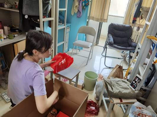 在宿舍内,老师们与学生视频连线、耐心沟通,仔细核对物品,充分按照学生意愿为其整理封装。老师们根据“一对一、点对点”的打包原则,从床上到床下,从门口到阳台,不落下每个角落;大到被子,小到照片,老师们都细心寻找、妥善装箱,每一件行李都记载着老师们对毕业生的不舍与惦念,尽最大努力满足毕业生同学们的多元化需求,用实际行动传递学院对毕业生的深深关切。