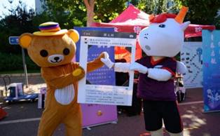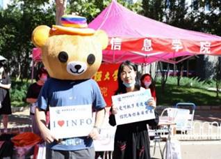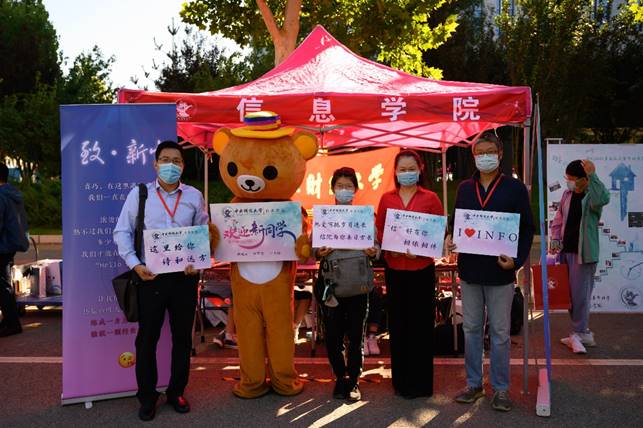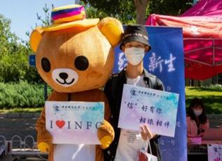本科生报到日,财宝和信息熊击掌庆祝,学校门口竖起了大红标语牌欢迎新同学