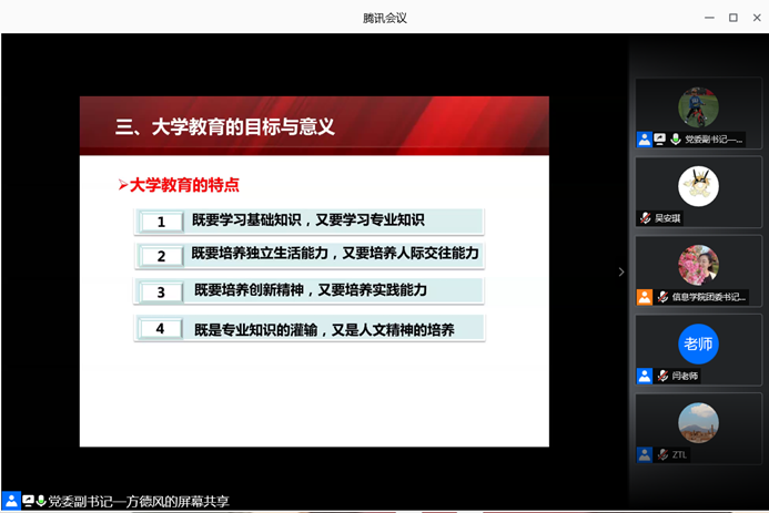 方德风副书记向家长们介绍了伟德国际1946bv的学生工作情况。在简单介绍学院2020级本科招生情况和学院学工队伍基本情况后,以马斯洛名句“教育是让一个人成为最好的自己”为引言,畅谈大学教育的目标与意义,分析大学生特点与新生可能面临的主要问题,并提倡家校共育学生成长成才。以及对新生报到注意事项和学校在疫情期间的防控举措及要求进行阐述,呼吁家长共同守护培育学生。