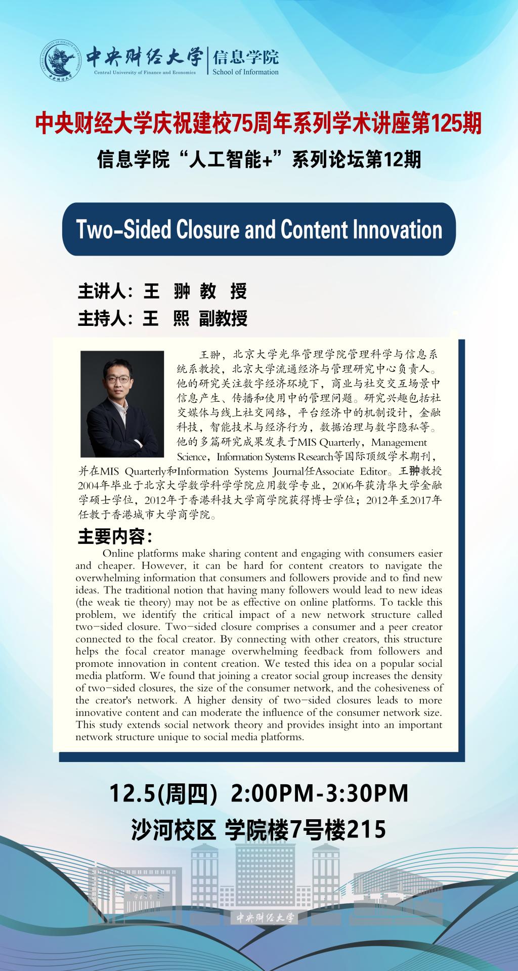 学术预告:“人工智能+”系列论坛——Two-Sided Closure and Content Innovation