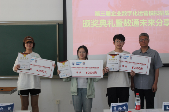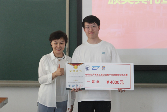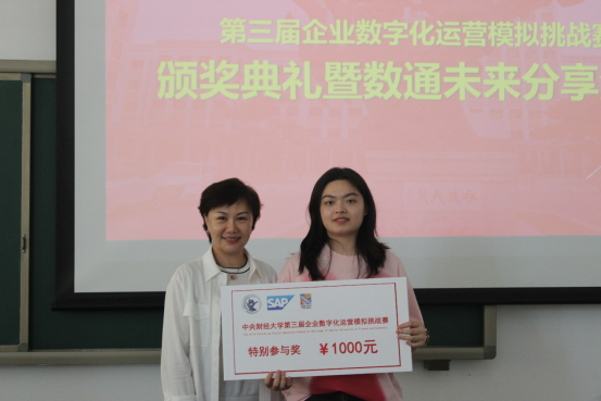 本次挑战赛晋级的59支队伍来自16个学院,77个专业,经过2个月多轮比赛有9支队伍进入决赛获得前三等奖。颁奖环节中,杨焜女士为一等奖团队“李展天团队”颁奖,李海峰副院长为“赵启成团队”“黄铄然团队”“何湘好团队”(二等奖)颁奖,甄雪、马海亮总监为“陈嘉慧团队”等5支三等奖团队颁奖,杨焜女士为特邀参赛的上一届校赛冠军,也是去年国赛入围前三名后,今年即将代表中国队参加第16届ERPsim国际赛的“周语墨团队”,颁发特别参与奖。
