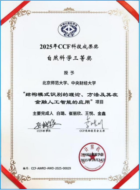 根据CCF官方介绍,“CCF科技成果奖”授予在计算机科学、技术或工程领域具有重要发现、发明、原始创新,在相关领域有一定国际影响的优秀成果。奖励类型分为:自然科学类、技术发明类、科技进步类。其中,自然科学类指在计算机及相关领域的基础研究或应用基础研究方面取得理论突破或做出原创性的研究成果、有重大/重要的科学发现,此次获奖彰显了我院在人工智能及其交叉学科领域的学术声誉和科研竞争力。学院将以此为契机,继续加大支持力度,激发创新潜能,力争产出更多标志性科研成果,为我国金融人工智能领域的发展和进步做出更大贡献。