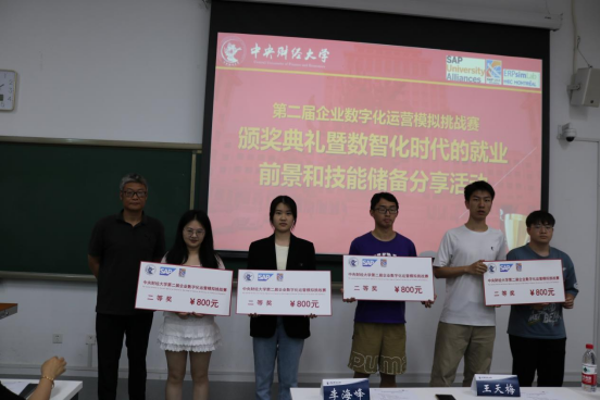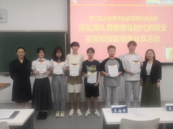 颁奖典礼上,伟德国际1946bv副院长李海峰向获奖的同学们表示热烈的祝贺,向协办方表示诚挚的感谢,期待挑战赛越办越好、惠及更多的同学。SAP创新社区大中华区总监杨焜指出该赛事是大学和企业优势资源互补的有益尝试,期望通过产学研融合推动人才培养水平的提升。本次挑战赛对于增长同学们的数字化运营经验、锻炼同学们的协作沟通能力,以及实时数据分析和决策能力具有重要意义,希望这样的比赛能激励更多的同学勇于在数字和人工智能时代积极探索自己的能力边界。随后,杨焜女士、李海峰老师、徐群群女生、甄雪女士等分别为一、二、三等奖队伍颁发了奖金和荣誉证书,以表彰他们的努力拼搏和所取得的优异成绩;王天梅老师和范丹老师为6位志愿者颁发了荣誉证书,以表彰他们为保障大赛顺利进行所做出的贡献。